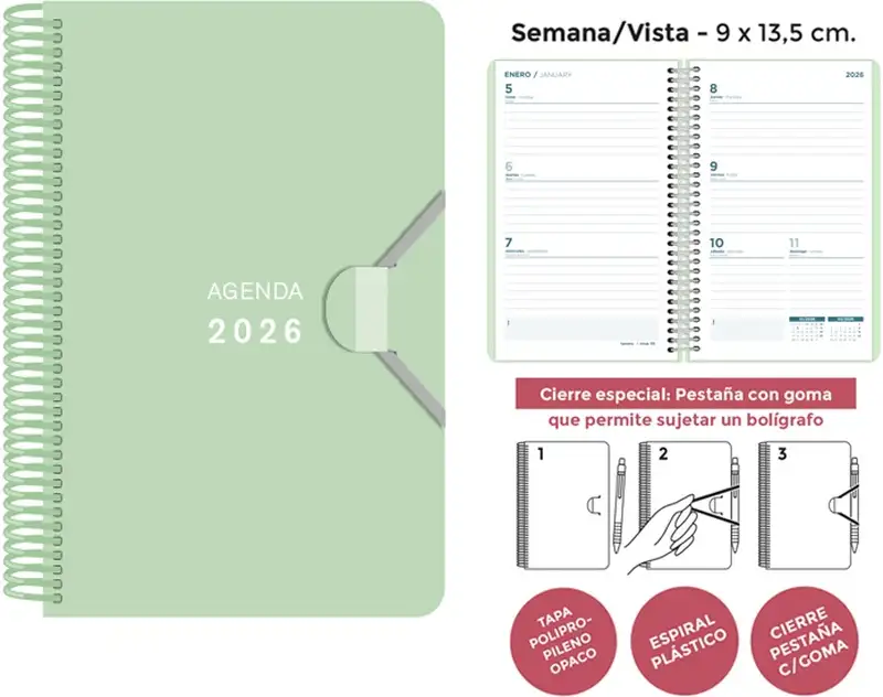 AGENDA ESPIRAL 2026 9X14 SV PP VERDE PASTEL