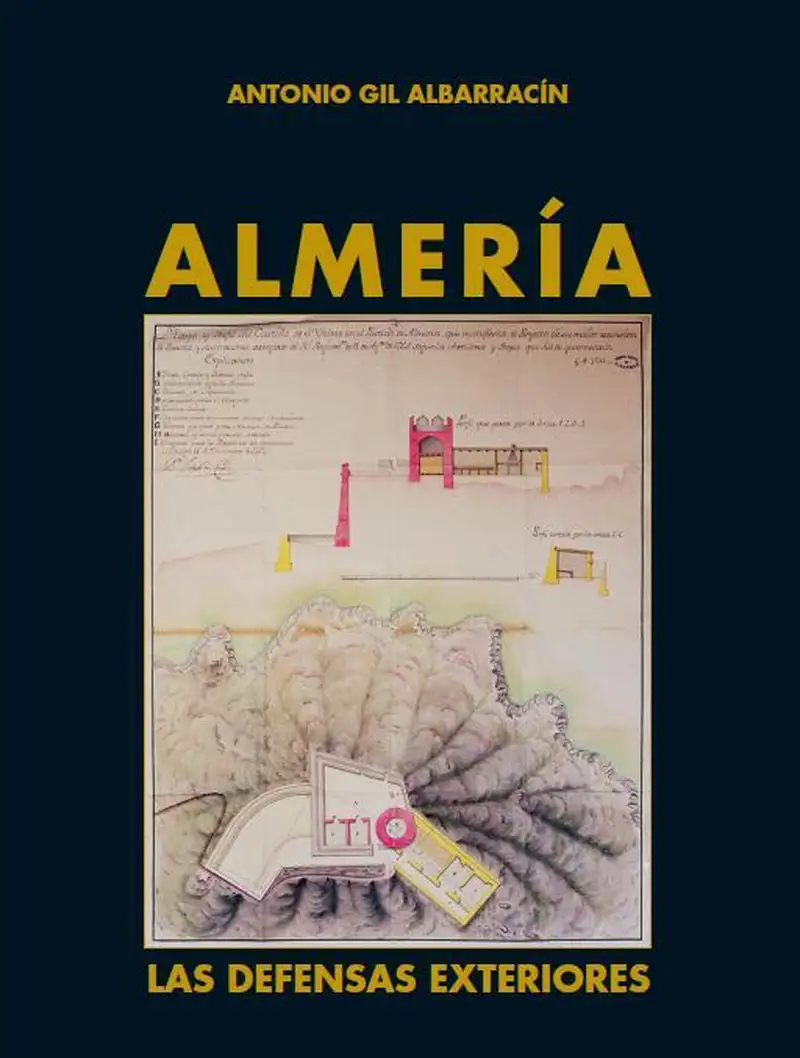 Obra que documenta las estructuras militares exteriores de Almería, incluyendo baluartes y búnkeres, con un enfoque en la arquitectura defensiva y el arte de la fortificación.