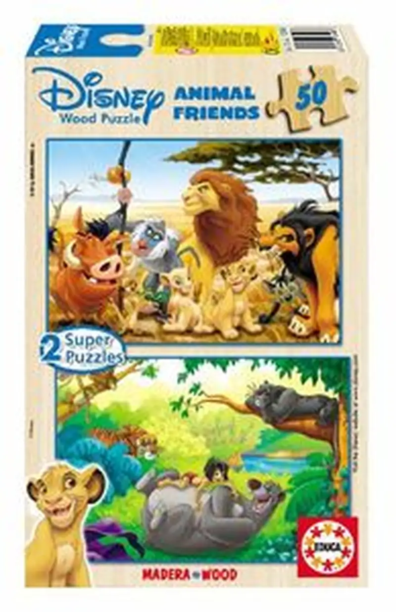 Dos puzles… ¡aventura por partida doble! Además, con piezas de madera, más grandes, fáciles de montar y con originales imágenes de tus personajes de Disney favoritos.2 puzles de 50 piezas. Tamaño: 26×18 cm.