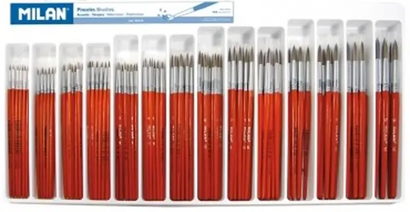 Pinceles redondos con mango corto de madera > barnizados en color marrón y virola de aluminio. Composición: 70% pelo natural de cabra + 30% sintético. Adecuado para acuarela > técnicas acuosas o témpera. Contiene: 12 pinceles del nº 00 al 8 y 6 pinceles del nº 9 al 12.