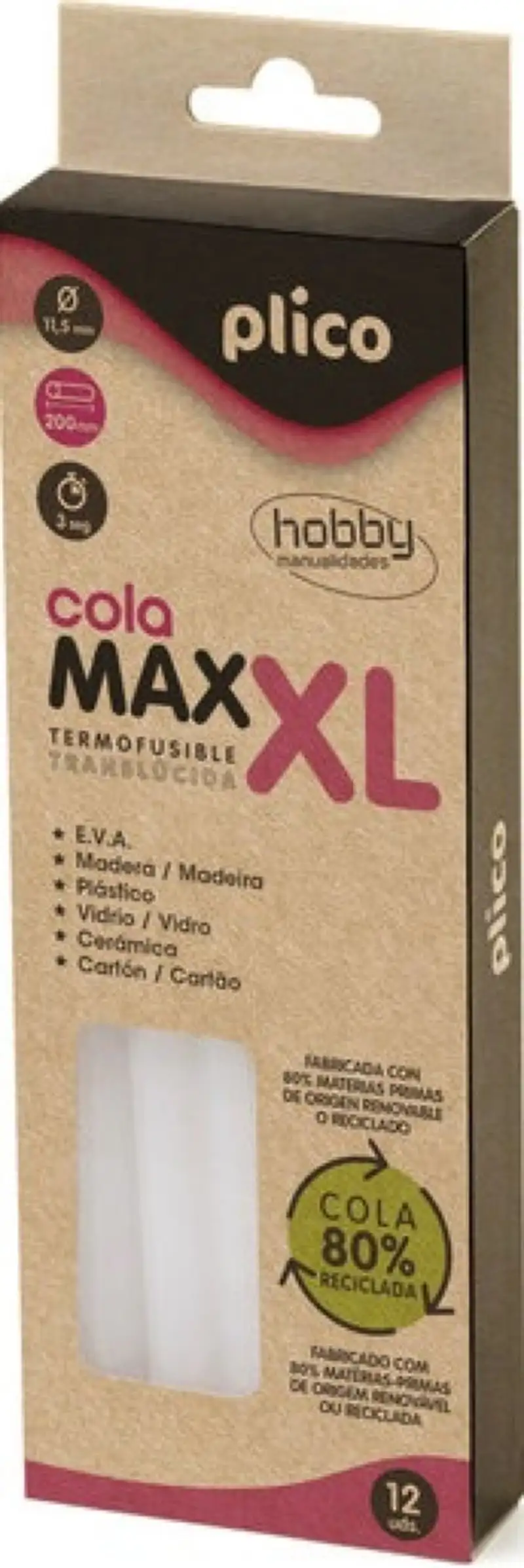 Cola termofusible Max-Xl/Mini-Xl. Adhesivo termofusible translúcido de uso general > fabricado con un 80% de materias primas de origen renovable o reciclado. Adhiere sobre gran cantidad de materiales tales como madera > cartón > telas > vidrio > cerámica y gran variedad de plásticos. Actúa también como sellador y rellena juntas y huecos.