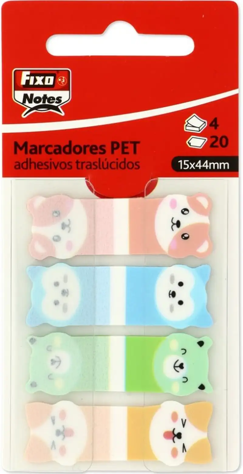 Marcadores adhesivos traslúcidos de animales. Permiten escribir fácilmente con lápiz o bolígrafo. Resistentes al agua. Reposicionables. 4 blocs con 20 marcadores cada uno. Medidas 15x44mm.