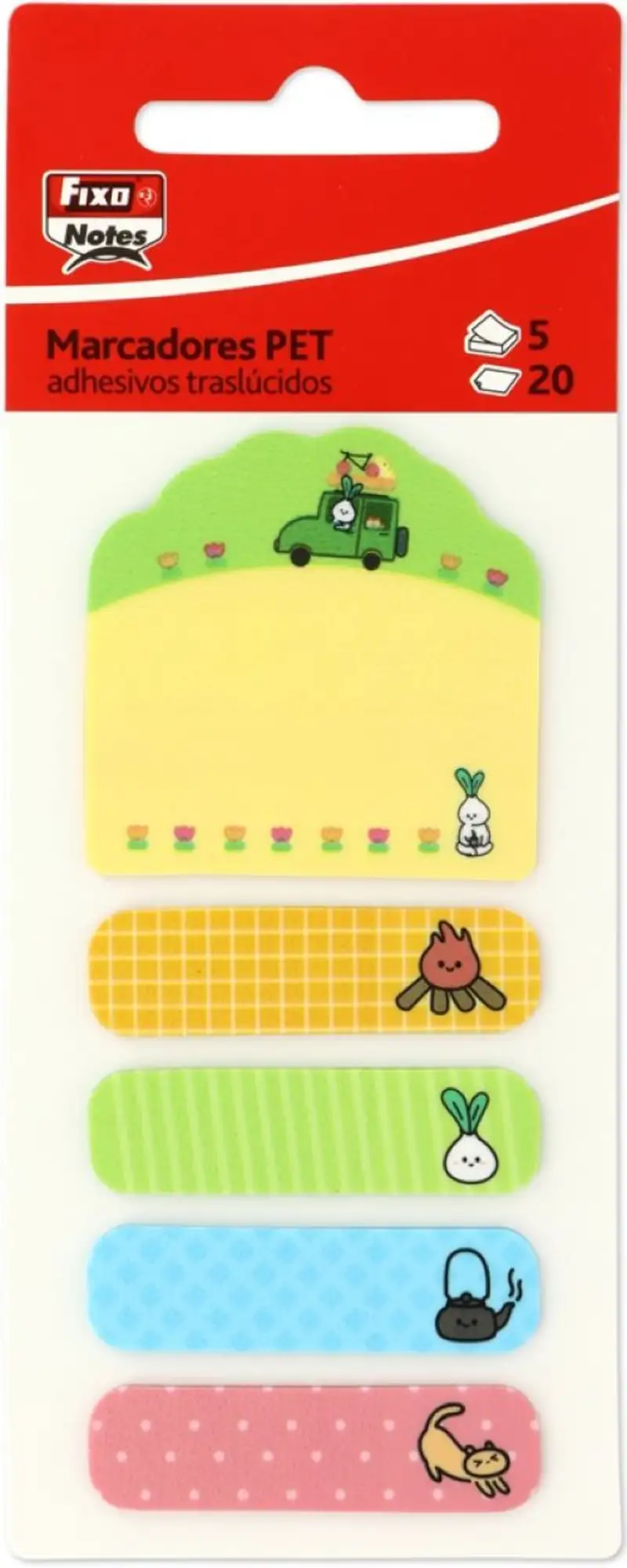 Marcadores adhesivos traslúcidos con diseño. Permiten escribir fácilmente con lápiz o bolígrafo. Resistentes al agua. Reposicionables. 5 blocs con 20 marcadores cada uno. Medidas 12x45mm
