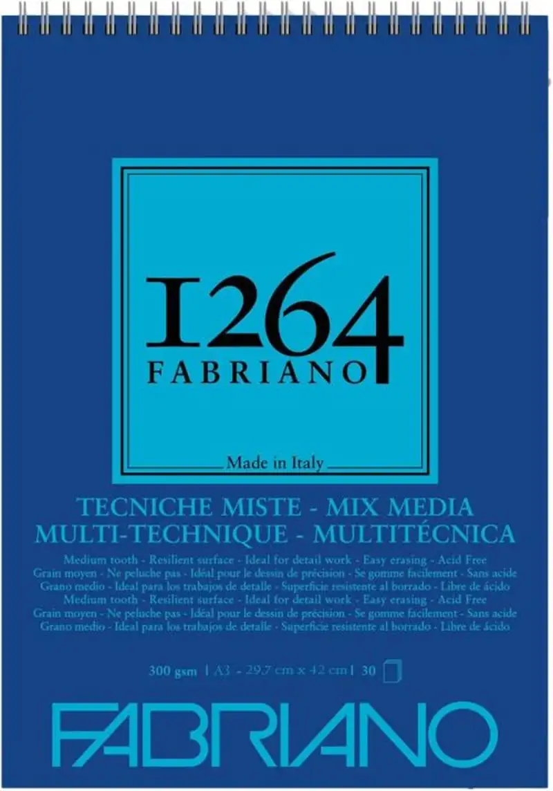 Fabriano 1264 Mix Media es un papel blanco suave de grano natural con tratamiento especial de encolado. Es adecuado para todas las técnicas secas (esbozo con lápiz > dibujo con lápìces de colores > etc.) y húmedas (gouache > acuarelas > etc.). Hojas microperforadas.