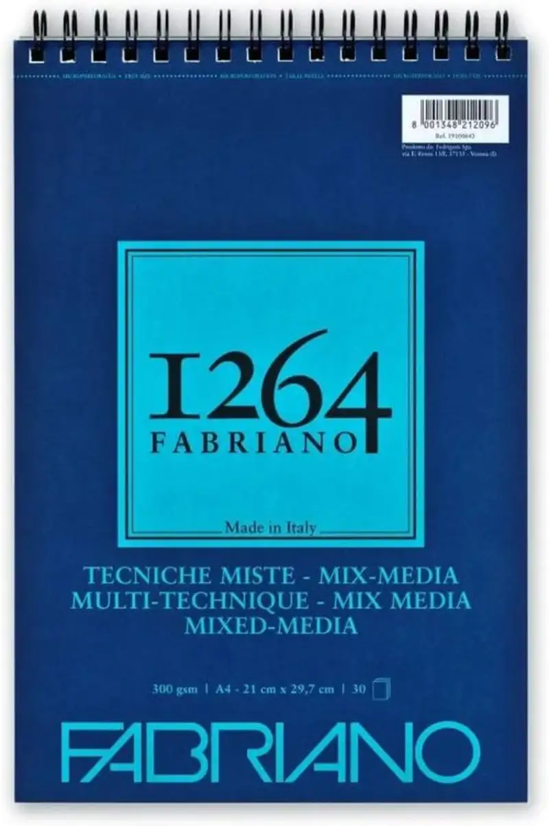 Fabriano 1264 Mix Media es un papel blanco suave de grano natural con tratamien Es adecuado para todas las técnicas secas (esbozo con lápiz > dibujo con lápìces y húmedas (gouache > acuarelas > etc.). Hojas microperforadas.