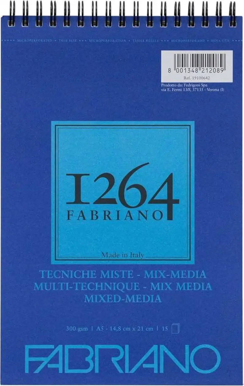 Fabriano 1264 Mix Media es un papel blanco suave de grano natural con tratamien Es adecuado para todas las técnicas secas (esbozo con lápiz > dibujo con lápìces y húmedas (gouache > acuarelas > etc.). Hojas microperforadas.