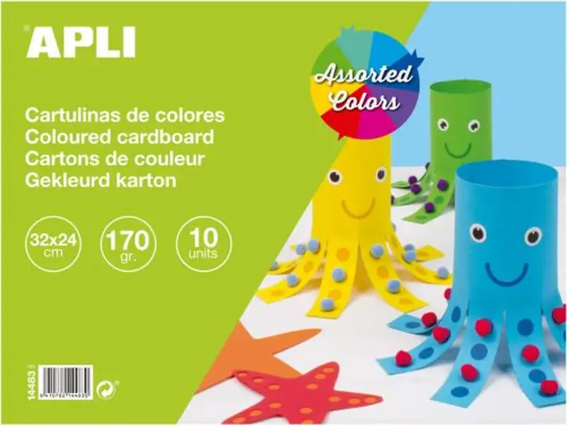 Bloc de cartulinas surtidas 32 x 24 cm 10 hojas Ref. 14483 Bloc de cartulinas de 170 g/m² tamaño 32 x 24 cm en colores surtidos: negro > marrón > naranja > rojo > lila > verde > azul > rosa > amarillo y blanco. Cada bloc contiene 10 hojas (1 por color). Ideales para todo tipo de manualidades > lettering > scrapbooking > cubiertas > separadores > papiroflexia > impresión de documentos Aptas para uso escolar > ya que están libres de ácidos.