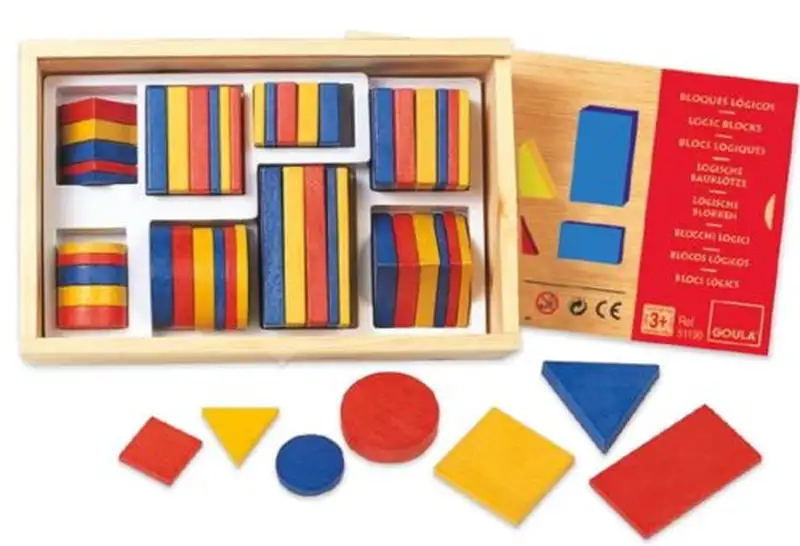 En esta preciosa caja de madera está todo lo necesario para que los más pequeños aprendan los atributos: grosor, forma, tamaño y color. Desarrolla la creatividad. A partir de 3 años.