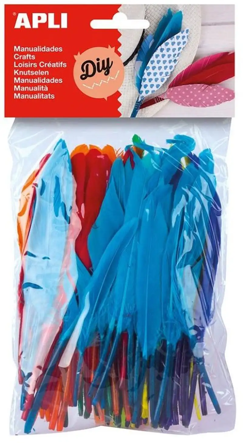 Producto ideal para realizar todo tipo de manualidades. Plumas de colores surtidos > 100 u./bolsa: 2 tamaños diferentes de 7cm y 16cm. Colores: Amarillo > naranja > rojo > verde > azul oscuro y turquesa.