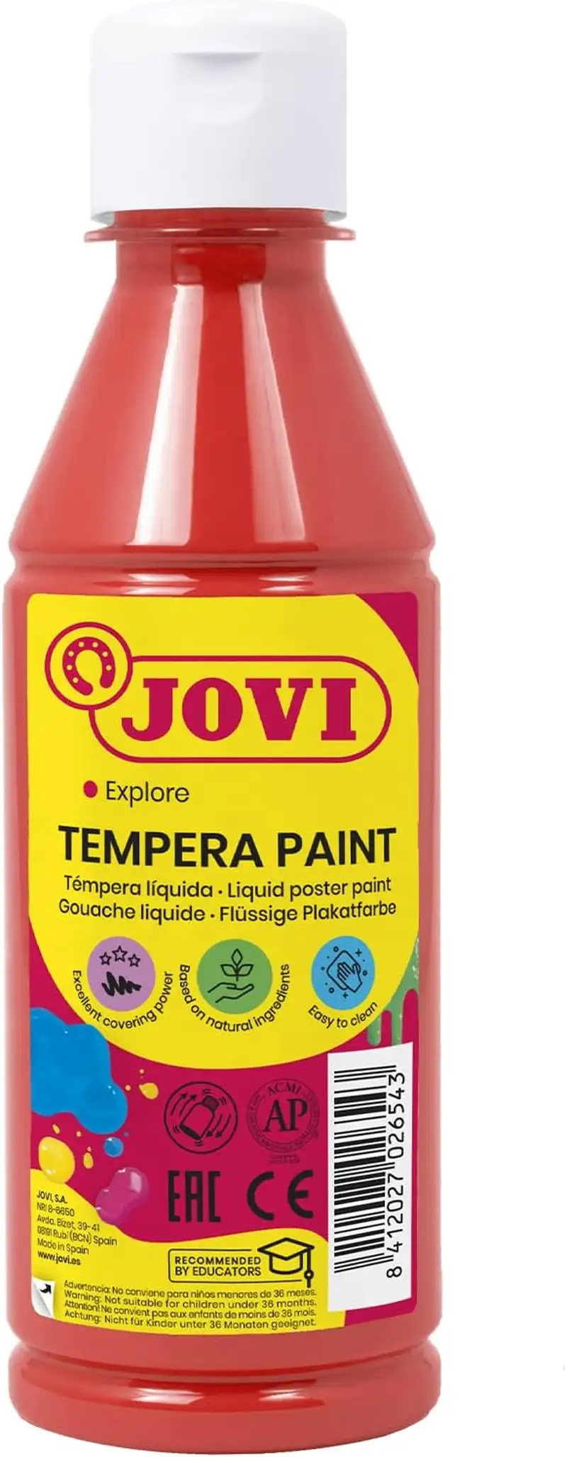 a témpera líquida Jovi es a base de agua > lista para usar > adecuada a partir de los 3 años de edad. Ideal para utilizar sobre papel > cartulina > madera > tela > barro > pasta de modelar > etc. Se aplica con pincel > rodillo > espátulas o esponjas. Su práctico tapón dosificador ayuda a no desaprovechar ni una gota.