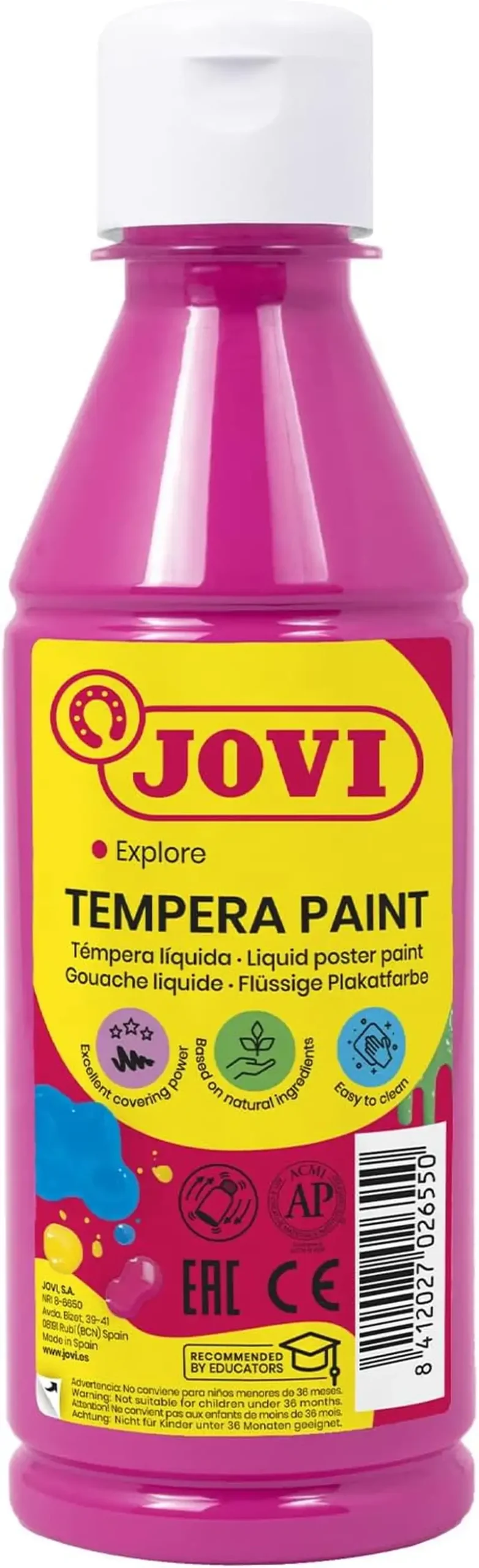 a témpera líquida Jovi es a base de agua > lista para usar > adecuada a partir de los 3 años de edad. Ideal para utilizar sobre papel > cartulina > madera > tela > barro > pasta de modelar > etc. Se aplica con pincel > rodillo > espátulas o esponjas. Su práctico tapón dosificador ayuda a no desaprovechar ni una gota.