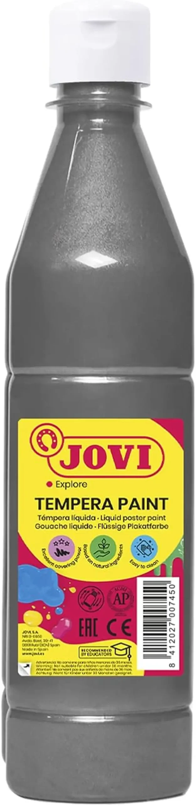 La témpera líquida jovi es a base de agua > lista para usar > adecuada a partir de los 3 años de edad. ideal para utilizar sobre papel > cartulina > madera > tela > barro > pasta de modelar > etc. se aplica con pincel > rodillo > espátulas o esponjas. su práctico tapón dosificador ayuda a no desaprovechar ni una gota.