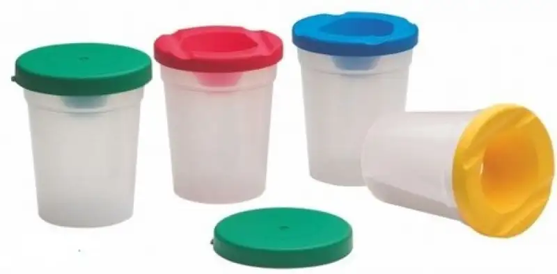 Bote para pintura de plástico translúcido muy resistente. La forma de la tapa > hace que el contenido no se vierta si se vuelca. Altura 9 cm. y 8 cm. de diámetro.