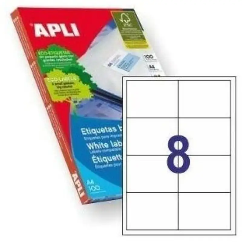Etiquetas para impresoras Inkjet > Láser y Fotocopiadoras. Medidas: 105 x 74 Cantidad de etiquetas : 800 Cantos: Rectos Color: Blanco Forma: Rectangular Tipo de adhesivo: Permanente Tamaño de la hoja: Din A4 Nº de hojas por pack: 100 Hojas