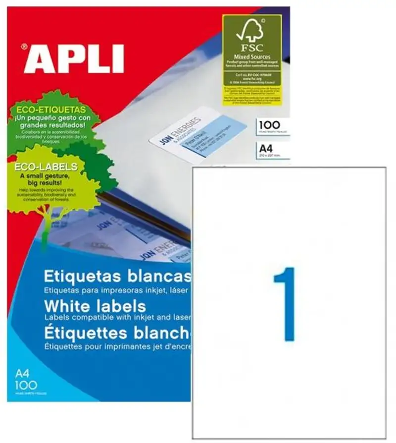 Etiquetas para impresoras Inkjet > Láser y Fotocopiadoras. Medidas: 210 x 297mm Cantidad de etiquetas : 100 Cantos: Rectos Color: Blanco Forma: Rectangular Tipo de adhesivo: Permanente Tamaño de la hoja: Din A4 Nº de hojas por pack: 100 Hojas