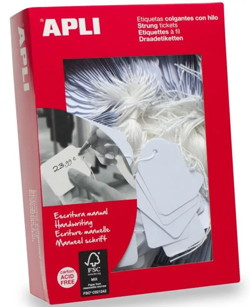 Etiquetas colgantes blancas tamaño 13 x 34 mm. Cada caja contiene 1.000 etiquetas con hilo. Estas etiquetas están fabricadas en cartulina de 200 g/m² > con un agujero preperforado e incluyen > cada una > un hilo de poliéster blanco ajustable a la medida deseada. Aptas para escritura manual con lápiz > bolígrafo (incluso de tinta gel) > rotuladores > permanentes > tinta de sello > etc. Ideales para usar en regalos > detalles de bodas > fiestas > álbumes > productos artesanales > folletos > almacenamiento > poner precios > tintorerías > etc