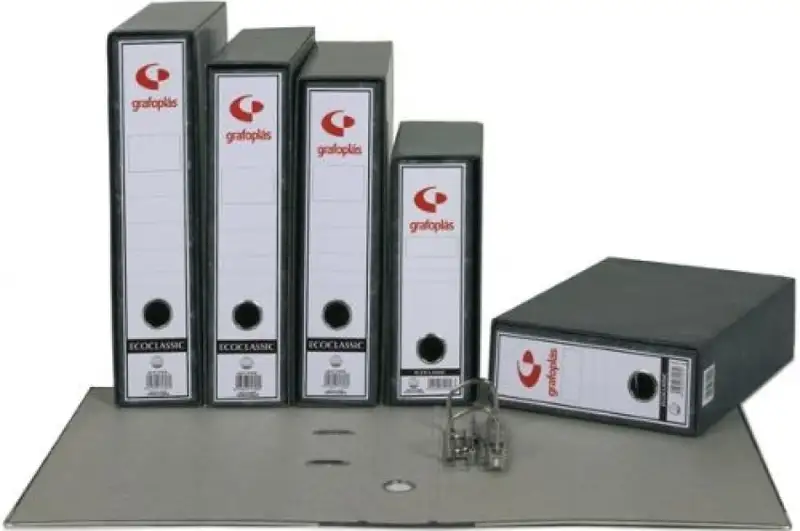 Archivador de cartón de 1,9 mm de espesor forrado. Interior y exterior jaspeado negro. Mecanismo de palanca niquelado de 75 mm. Compresor metálico > ollao y cantoneras largas. Etiqueta impresa. Sin caja. Ancho de lomo 80 mm.