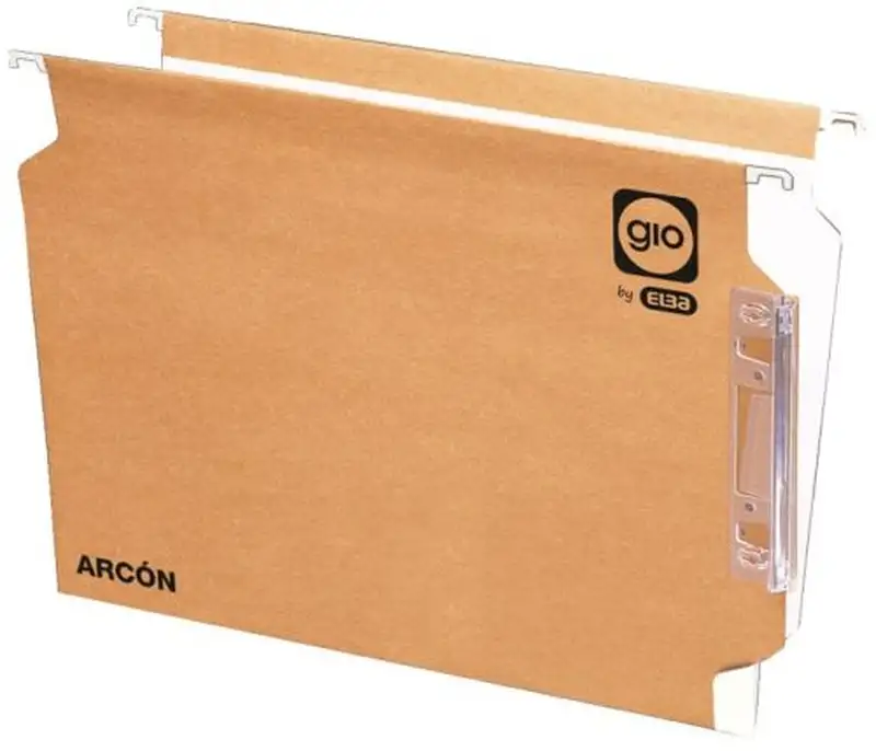 Carpetas colgantes armario kraft bicolor con varilla metálica Gio > fondo V caja de 25. Fabricadas en kraft bicolor de 250 g/m2 > recuperado previo a su desecho o reciclado. Libre de cloro y sin residuos químicos. Visor lateral rígido con efecto lupa. Varillas metálicas. Medidas: 34,5×27,5cm. Eje: 33cm.