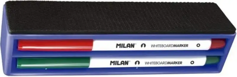 4 rotuladores para pizarra blanca contenidos en cajita-borrador con soporte magnético para que ésta pueda ser adherida a la pizarras metálicas (color negro > azul > rojo y verde). Borrables en seco. Tinta a base de alcohol. Punta redonda 3,7 mm Ø.Recomendamos tapar después deusar y almacenar en posición horizontal.