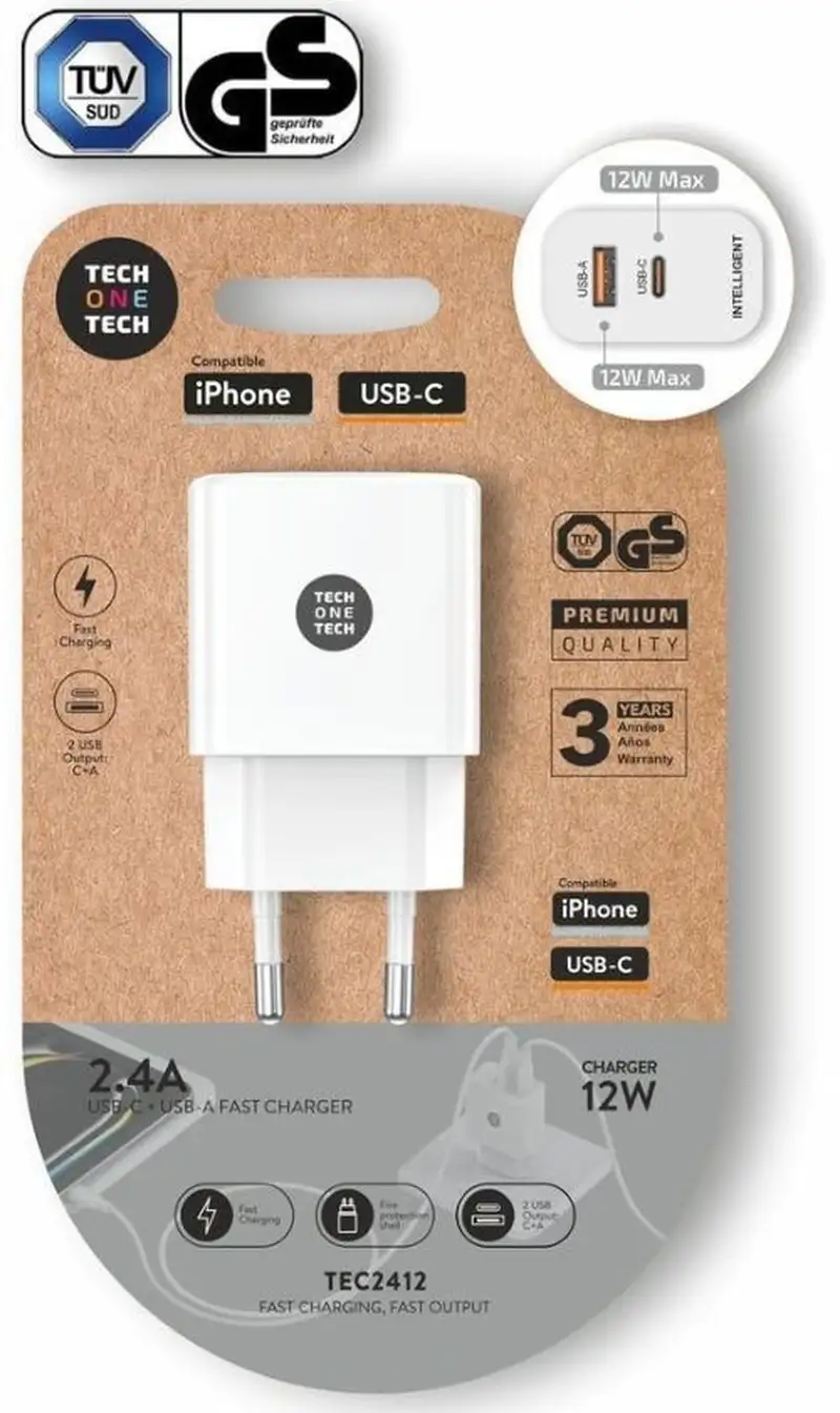 CARGADOR 12W SALIDA USBC + USBA BLANCO