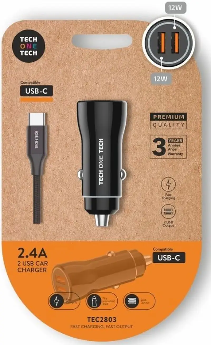CARGADOR MECHERO COCHE + CABLE USBC NEGRO 12W NEGRO