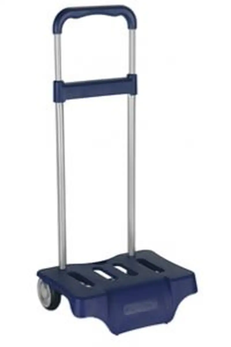 Carro Portamochilas de acero pintado > material plástico polipropileno y ruedas de polipropileno y goma. Cerrado 30 x 23 x 52.5 cm. Abierto 30 x 23 x 85 cm.