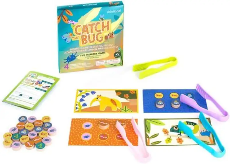 26 piezas de bichos de madera, 4 tableros de jugador, 4 pinzas, 1 libro de instrucciones.Catch the bug es un emocionante juego de mesa diseñado para despertar la curiosidad y desarrollar habilidades motoras finas en los niños. Utilizando pinzas, los jugadores deberán voltear las piezas y buscar parejas de bichos que coincidan con las cartas asignadas. A medida que completes parejas, podrás alimentar a tu Atrapabicho y avanzar en el juego. ¡El jugador con más bichos al final será el ganador!Este juego educativo fomenta la coordinación ojo-mano, el agarre de pinza y la atención, habilidades esenciales en el desarrollo infantil temprano. Además, está fabricado con materiales sostenibles, garantizando diversión responsable con el medio ambiente.Contenido: 26 piezas de bichos de madera, 4 tableros de jugador, 4 pinzas y un libro de instrucciones. Recomendado para mayores de 5 años, es perfecto para jugar en familia o en el aula, combinando aprendizaje y diversión en cada partida.