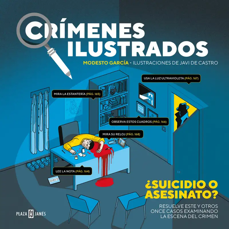 El juego de redes sociales más viral por fin en formato libro de manos de su creador, el tuitstar Modesto García. Ha llegado el momento de convertirte en el protagonista de tus novelas negras y thrillers favoritos. Incluye casos exclusivos nunca antes vistos en internet. ¿Eres capaz de resolver un asesinato observando simplemente la escena del crimen? Transfórmate en un auténtico detective de homicidios y empieza a atar cabos porque aquí la historia no te la cuentan, la tienes que desentrañar tú mediante la observación y la deducción. ¿Por qué hay una botella rota en el suelo? ¿A quién pertenecen esas huellas? ¿Qué quiso decir la víctima en su último mensaje de texto? Poco a poco irás entendiendo lo ocurrido y acotando el círculo de sospechosos hasta encontrar al culpable. Crímenes ilustrados te atrapará por su inventiva, imaginación y originalidad. Por primera vez, una historia de detectives no se narra de forma lineal, sino que es el lector el que debe demostrar sus aptitudes deductivas y ser capaz de armar el puzle completo. ¿Aceptas el reto? Entretenido y adictivo: el verdadero crimen es no atreverse con el juego más seguido en internet. Desde suicidios sospechosos hasta cruentos homicidios, disputas familiares por herencias millonarias, crímenes pasionales, identidades ocultas, secretos mortales y misterios por desvelar, el lector tendrá que resolver doce casos diferentes valiéndose de su perspicacia y observación. Reseñas: «Resolver los enigmas de los Crímenes Ilustrados en Twitter e Instagram se ha convertido en deporte nacional.» El Español «El crimen ilustrado que ha enganchado a miles de personas de Twitter.» El País «Los casos de asesinatos que tienen en vilo a Twitter.» El Economista «Los nuevos retos para detectives tuiteros.» La Vanguardia «El nuevo fenómeno viral.» El Periódico «Si Agatha Christie levantara la cabeza y viera la que está montando en redes Modesto García con sus Crímenes Ilustrados, se moriría otra vez, pero de la envidia.» Yorokobu