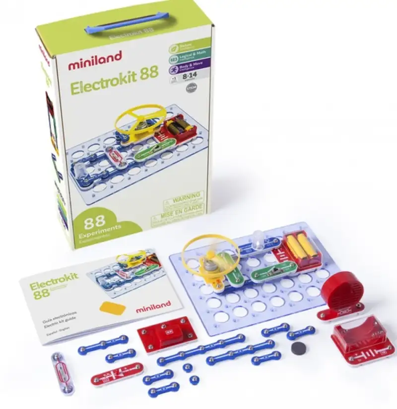 Primeros pasos en el mundo de la electrónica. Los portapilas, motores, altavoces, hélices, interruptores, portabombillas con bombillas, imanes, etc, se conectan sin herramientas para crear los 88 montajes que aparecen en el manual. Necesita pilas (no incluidas)