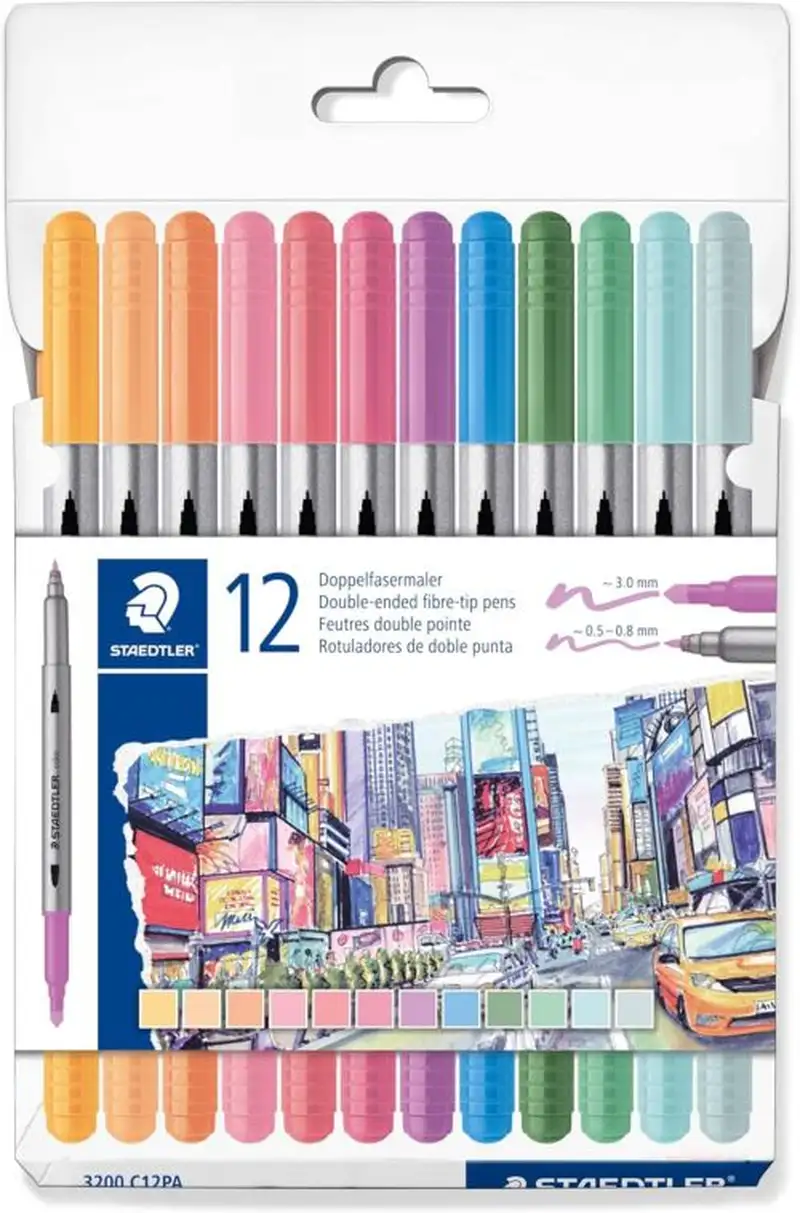 Rotuladores de doble punta de fibra > con puntas resistentes a la presión. Perfectos para esbozar > dibujar > ilustrar > escribir y colorear. Anchos de línea entre aprox. 3,0 mm y 0,5-0,8 mm.