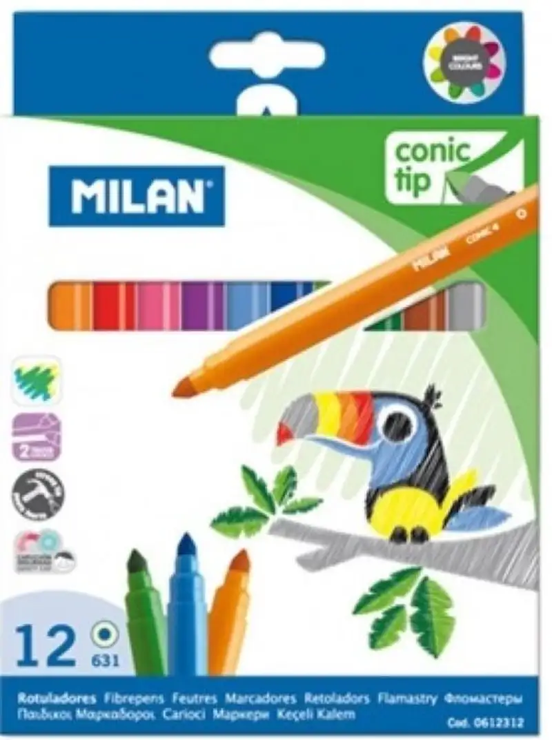 Rotuladores de punta cónica 5 mm Ø que permite realizar trazos desde 0,75 mm a 3 mm. Punta resistente a los golpes y a la presión. Tinta a basede agua que proporciona unos colores brillantes de fácil aplicación y mezclables entre sí. Por su tipo de punta se recomiendan para rellenar superficies de color. Puede lavarse fácilmente sobre la mayoría de tejidos(poner la prenda en remojo en agua fría durante una hora y lavar a máquina > también con agua fría). Con capuchón de seguridad ventilado. 12 colores.