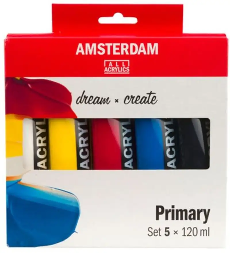 Set de 5 colores acrílicos primarios Amsterdam de 120 ml. Este set es la opción ideal para empezar tu colección de pinturas acrílicas. La serie Standard de acrílicos Amsterdam ofrece colores vivos > es fácil de trabajar > muy versátil > con viscosidad media y elaborada con pigmentos de gran calidad y resistencia a la luz. Incluye los colores: Blanco Titano 105 > Amarillo primario 275 > Magenta primario 369 > Cian primario 572 > Negro óxido 735.