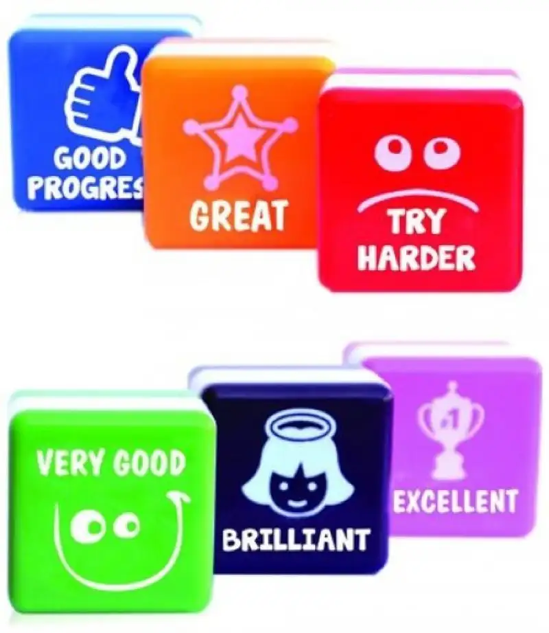 Sello entintado. Presentación en caja de 6 unidades. Colores: azul > verde > naranja > morado > rojo > rosa. Medidas: 25 X 25 mm.