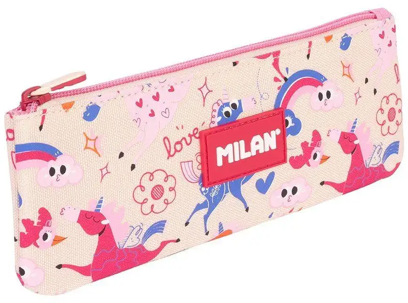 Estuche escolar portatodo pequeño y plano. Colección Flowicorn con diseños de unicornios > flores y corazones en tonos rosados y azules > que invita a soñar e imaginar historias de fantasía. Composición tejido: poliéster. Medidas: 23 x 9 x 1,5 cm.