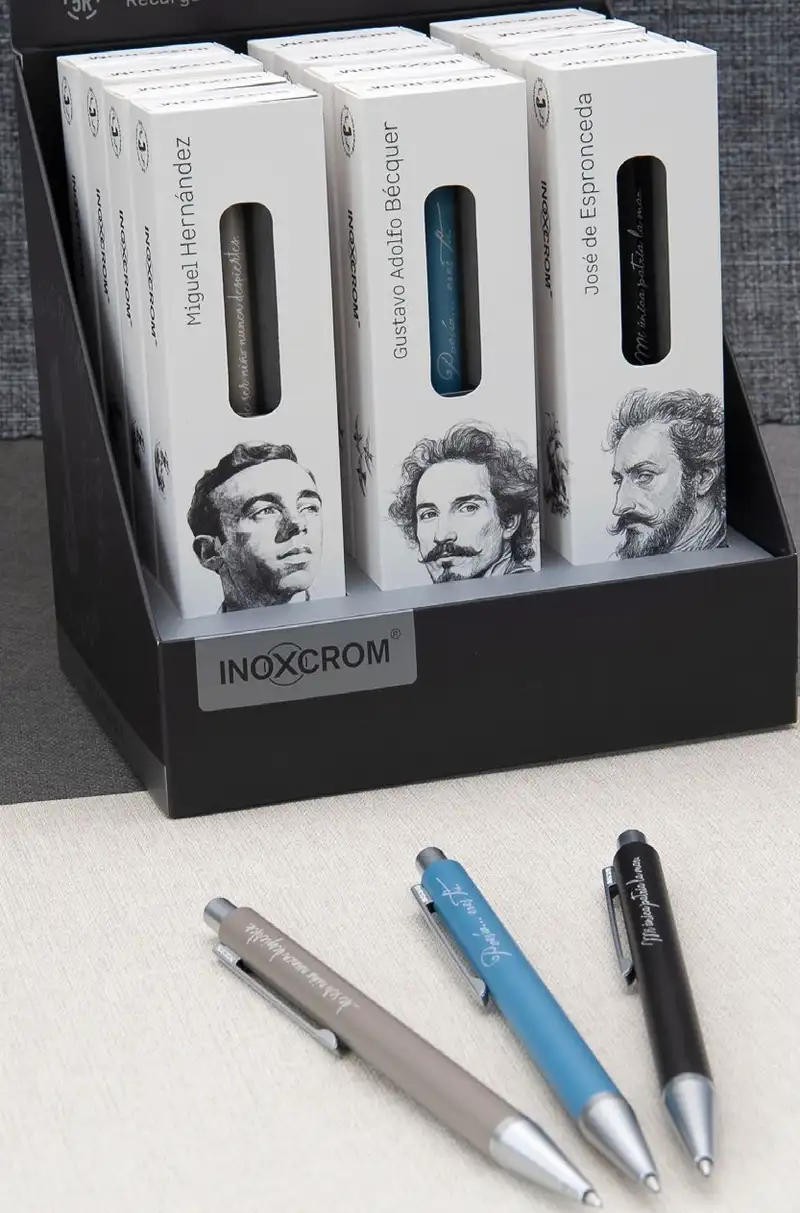 Bolígrafos de aluminio lacado mate y grabado láser con cita del autor con mecanismo de pulsación y líneas puras y minimalistas. Colección especial de grandes poetas de la literaturas. Recambio de bolígrafo INOXCROM« con punta de acero inoxidable y bola de carburo de tungsteno de 1mm. Estuche regalo C-BOX decorado a juego. Modelo coleccionable. Obsequio de 12 marcapáginas a juego.’