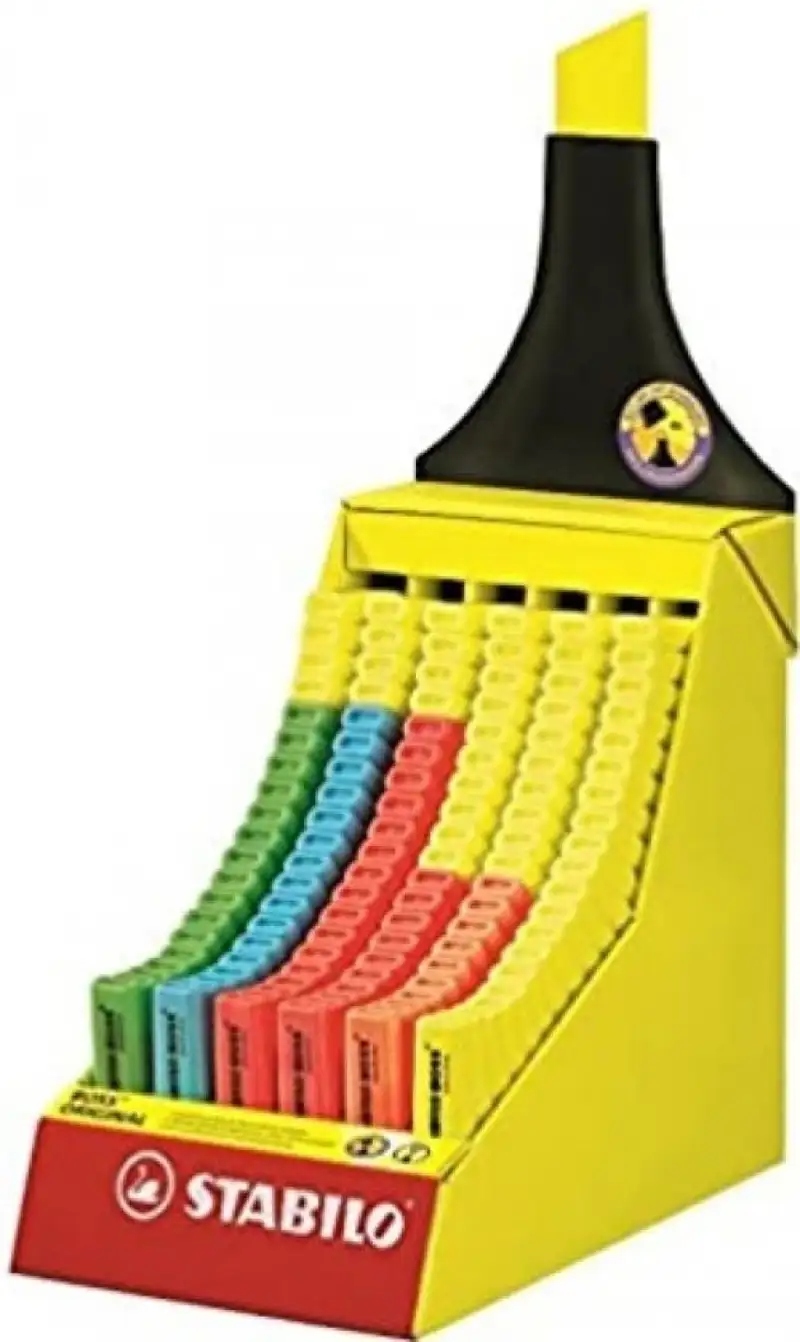 Expositor de cartón con la forma del STABILO BOSS. Contenido 120 uds. surtidas en 6 colores fluorescentes: – 52 Amarillo. – 16 Azul > verde y rosa. – 10 Rojo y naranja.