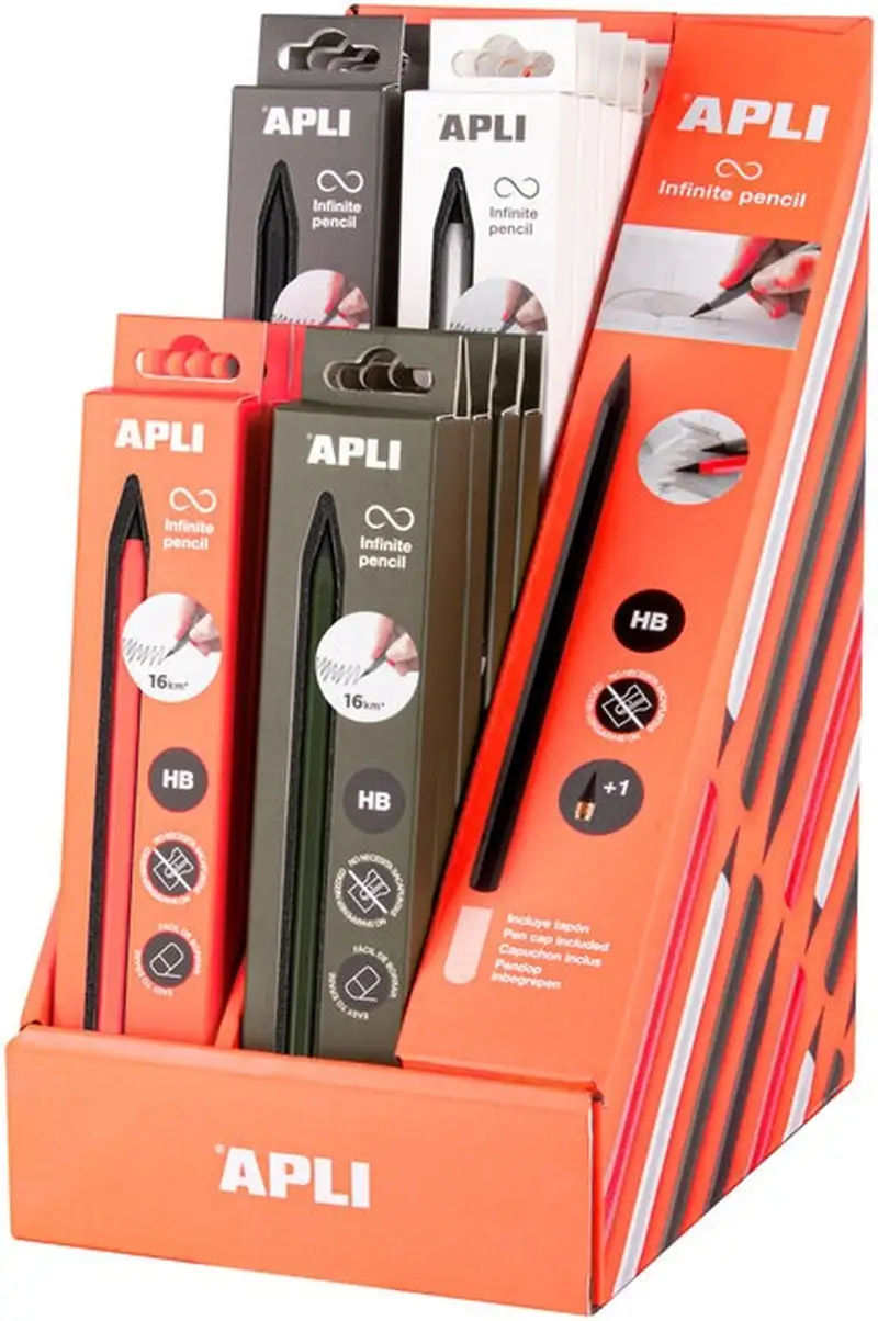 Expositor de 20 lápices Infinito que permiten escribir sin parar. Gracias a su mina suavemente abrasiva y duradera > el innovador lápiz Infinito te posibilitará escribir hasta 16 km sin requerir afilado > proporcionándote así una concentración óptima durante tus actividades de escritura y dibujo. El expositor incluye 20 packs de lápices en 5 colores distintos: negro > blanco > kaki y naranja fluor. Colores atemporales acompañados de un atrevido toque fluorescente. Cada pack dispone de 1 lápiz Infinito > 1 minas de recambio HB y 1 tapón translúcido de protección.