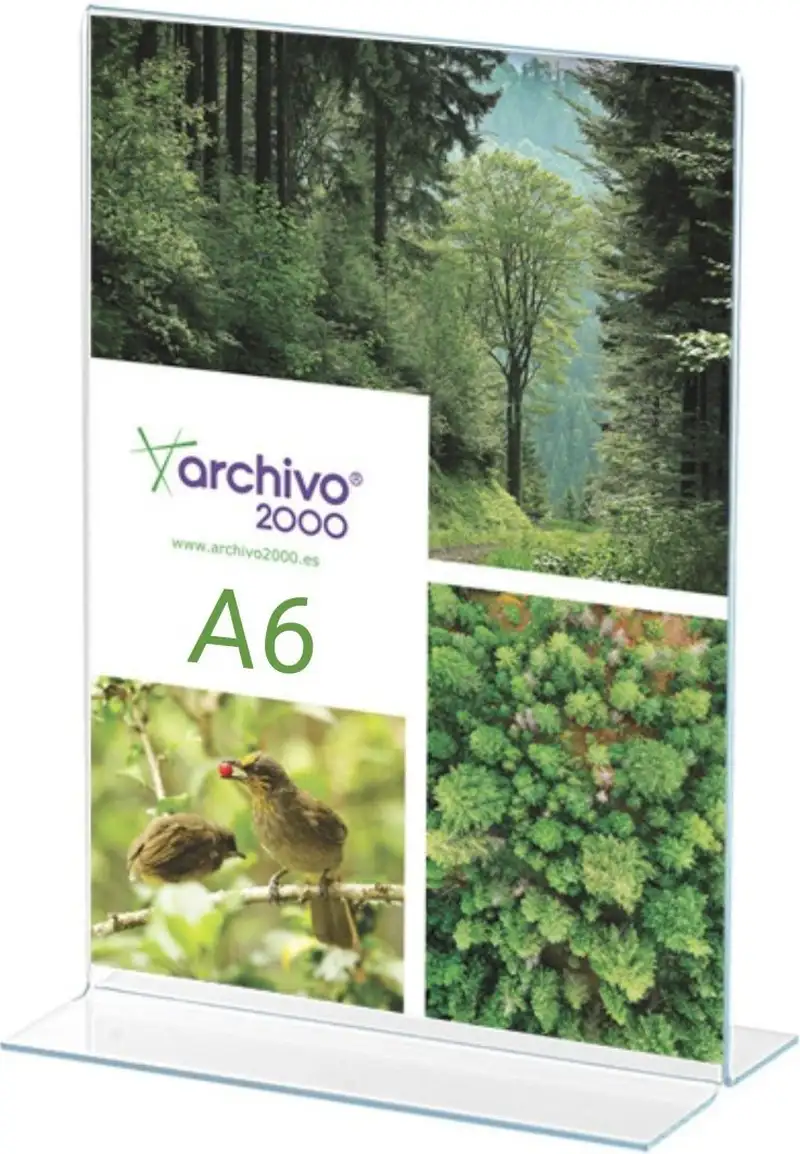 Expositor forma de T DIN A6 vertical Archivo 2000. Fabricado en poliestireno ultra transparente de gran calidad y resistencia. El documento se introduce por la parte inferior. Amplia base que lo hace muy estable. Fabricación española. Medidas: 45x105x155 mm