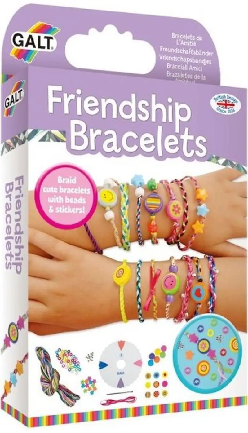 Crea pulseras de la amistad trenzadas y tejidas con hilos, cuentas y cintas de colores. Haz pulseras de cordón geniales con la rueda de trenzado de espuma. Contenido: hilos de algodón de 60 m (65 yardas) en varios colores, cinta de raso, cuentas variadas, pegatinas, rueda de espuma para trenzar, punzón, guía.