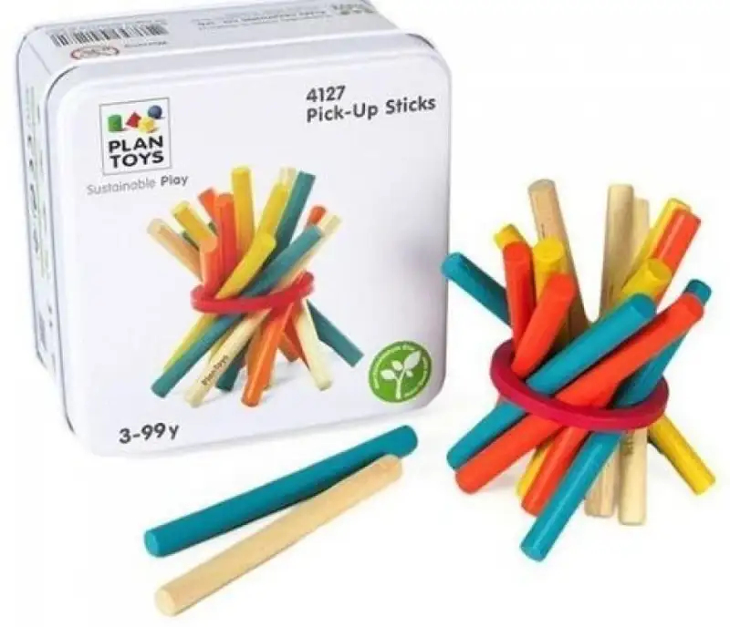 Juego de madera de PlanToys para desarrollar las destrezas motrices de los niños, Comience el juego recogiendo el palo uno por uno y no hagáis que el resto caiga. fabricado con madera de caucho prensada, limpia y natural se usan sólo tintes vegetales no tóxicos a base de soja y agua. Este juguete es sostenible 100%. Todo el embalaje es cartón y papel Edad Recomendada: a partir de 3 años.