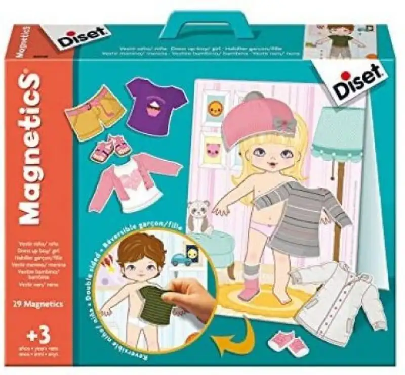 Combinar las diferentes piezas magnéticas para vestir al niño y a la niña con diferentes conjuntos, reconociendo así las piezas de ropa. diferentes piezas de ropa.
