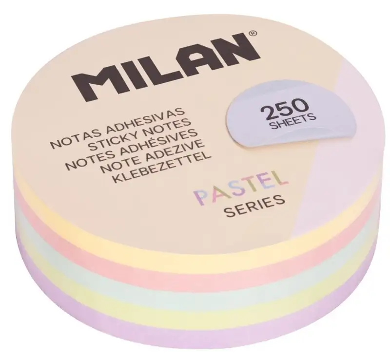 Notas adhesivas removibles redondas en colores pastel. Ideales para destacar mensajes > apuntes > clasificar y ordenar información. Contiene 250 hojas > 50 de cada color: amarillo > rosa > azul > verde y lila. Medidas: Ø 67 mm x 2,8 cm.