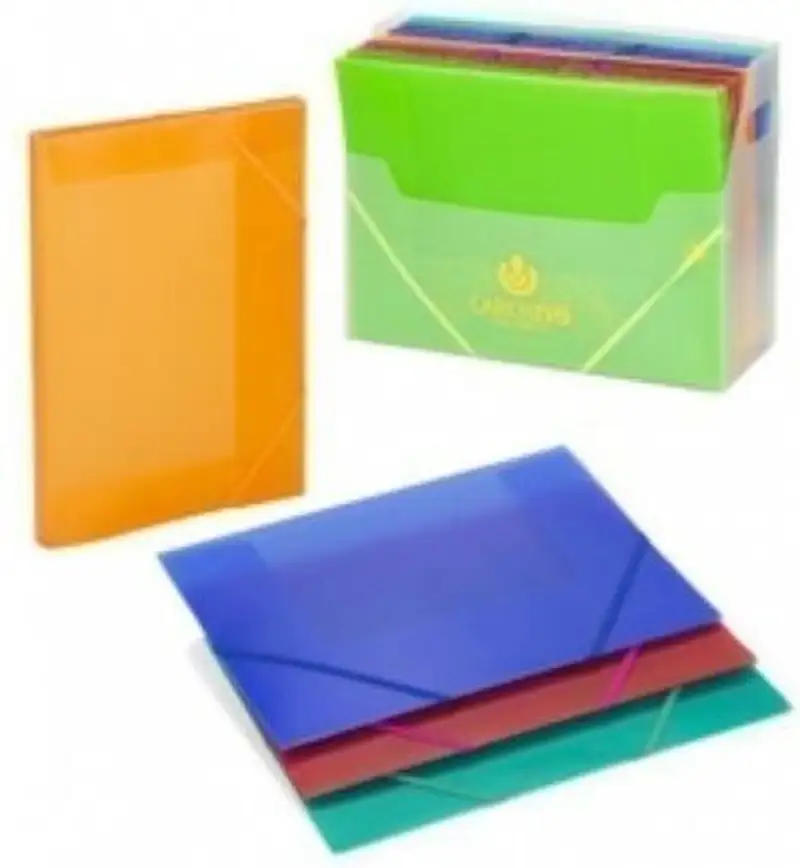 Carpeta 3 solapas polipropileno colores traslúcidas. Tamaño Folio. Goma plana remachada.