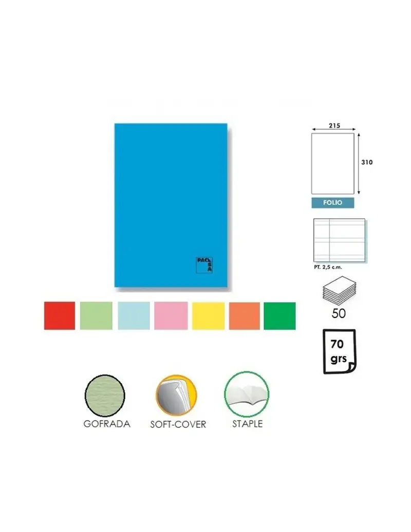 Libretas de 50 hojas en papel extra de 70 gr. Tapa cartulina gofrada. 8 colores surtidos