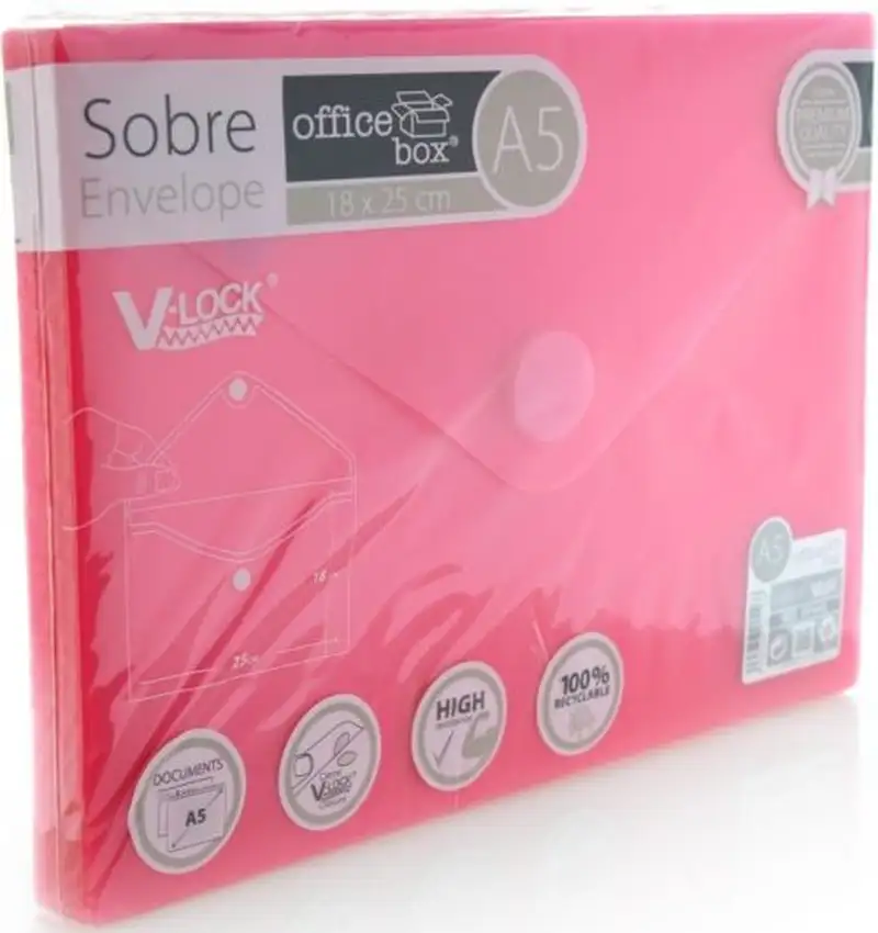 Sobre Apaisado con cierre V-lock extra grande. Tamano A5 Colores clásicos. Material translúcido con textura soft touch exclusivo. Presentado en Bolsa Impresa con 10 unidades. Tamaño: 18 x 25 cm Material: Polipropileno 100% reciclable.
