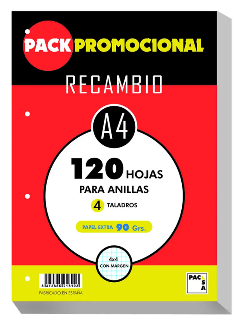 RECAMBIO A4 100+20H 4 TALADROS 90G CUAD.4X4 C/M PACSA
