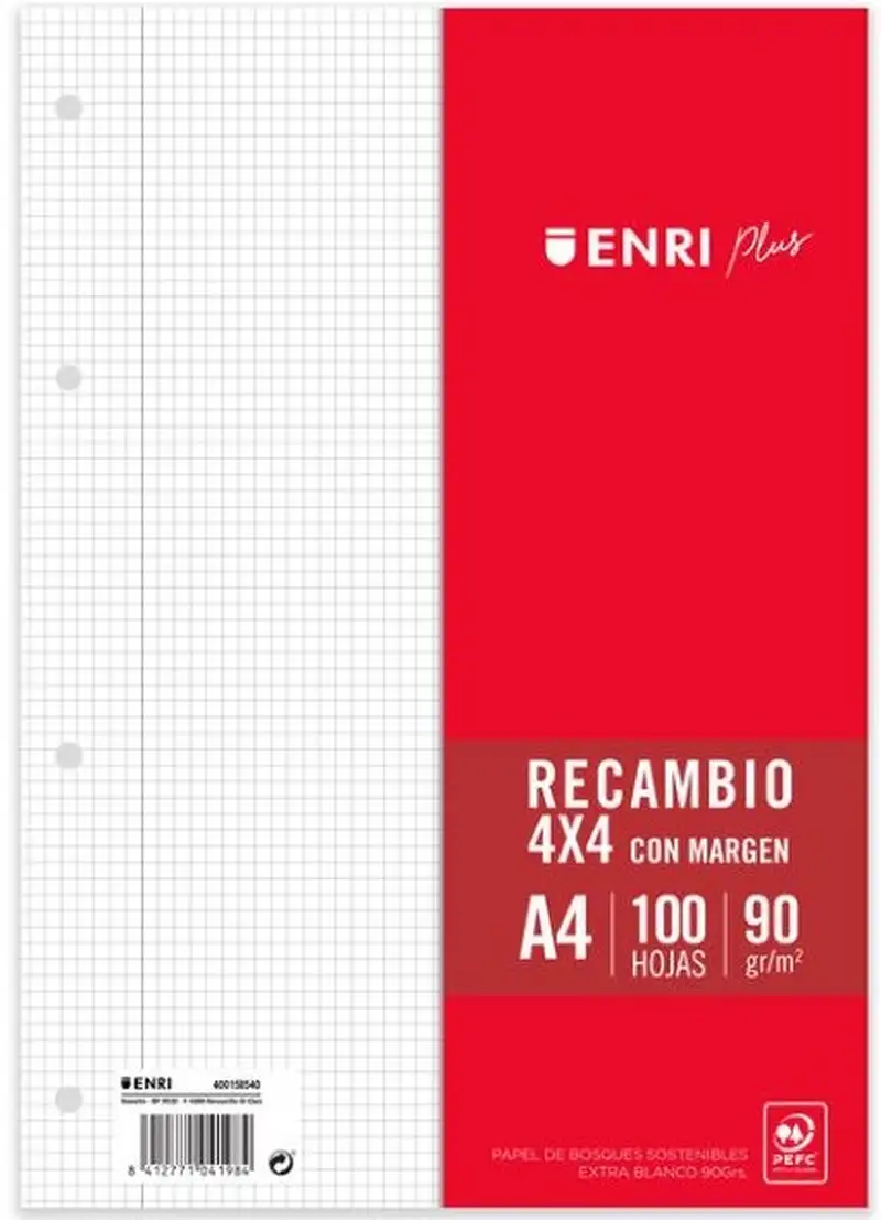 RECAMBIO A4 4 TALADROS 100H 90G CUAD 4X4 C/MARGEN ENRI