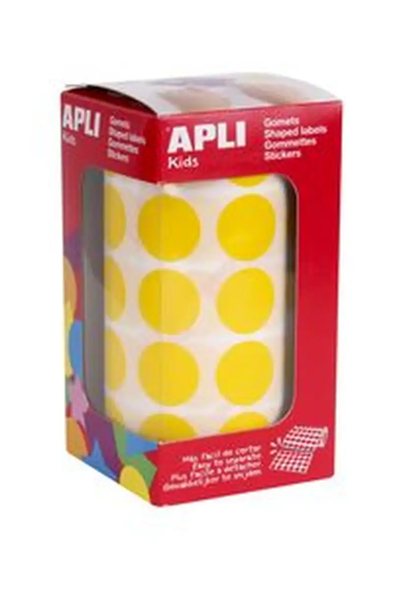 Medidas: ø 20mm Cantidad : 1770 Tipo de producto: Gomets Color: Amarillo Forma del gomet: Circulo Pack de gomets: En estuche Tipo de adhesivo del gomet: Permanente