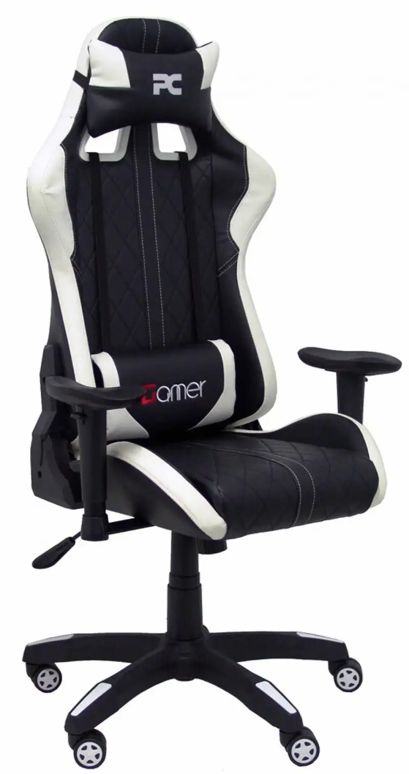 Silla Gaming con mecanismo basculante > regulable en altura y brazos regulables incluidos – Asiento y respaldo tapizados en SIMILPIEL negro y blanco