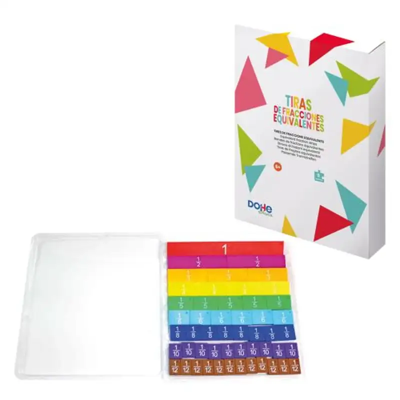Las tiras de fracciones equivalentes (diagrama de Freudethal) son un conjunto de piezas de cartón, entre las que encontramos la tira de la unidad, las tiras de los medios, tercios, cuartos, quintos, sextos, octavos, décimos y duodécimos. Este material permite trabajar, de forma gráfica, la comparación y la equivalencia de fracciones, así como la suma y resta de fracciones de distinto denominador. Contenido: 51 piezas. Recomendado para tercer ciclo de Primaria.